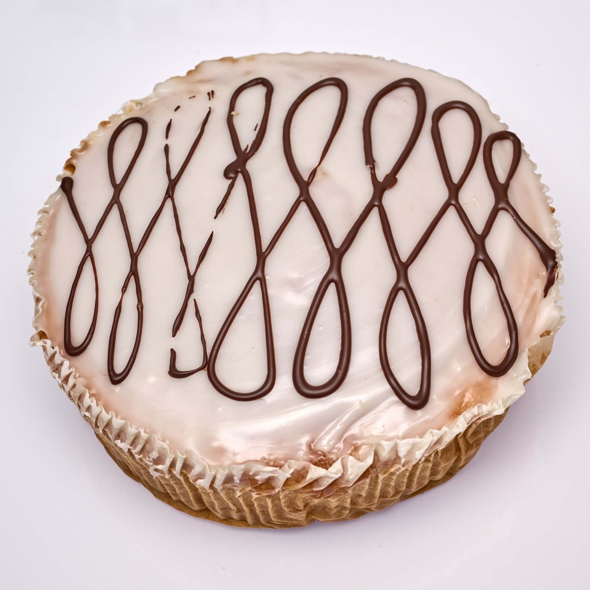 Delicious white pound cake, covered with white icing and chocolate drizzle.