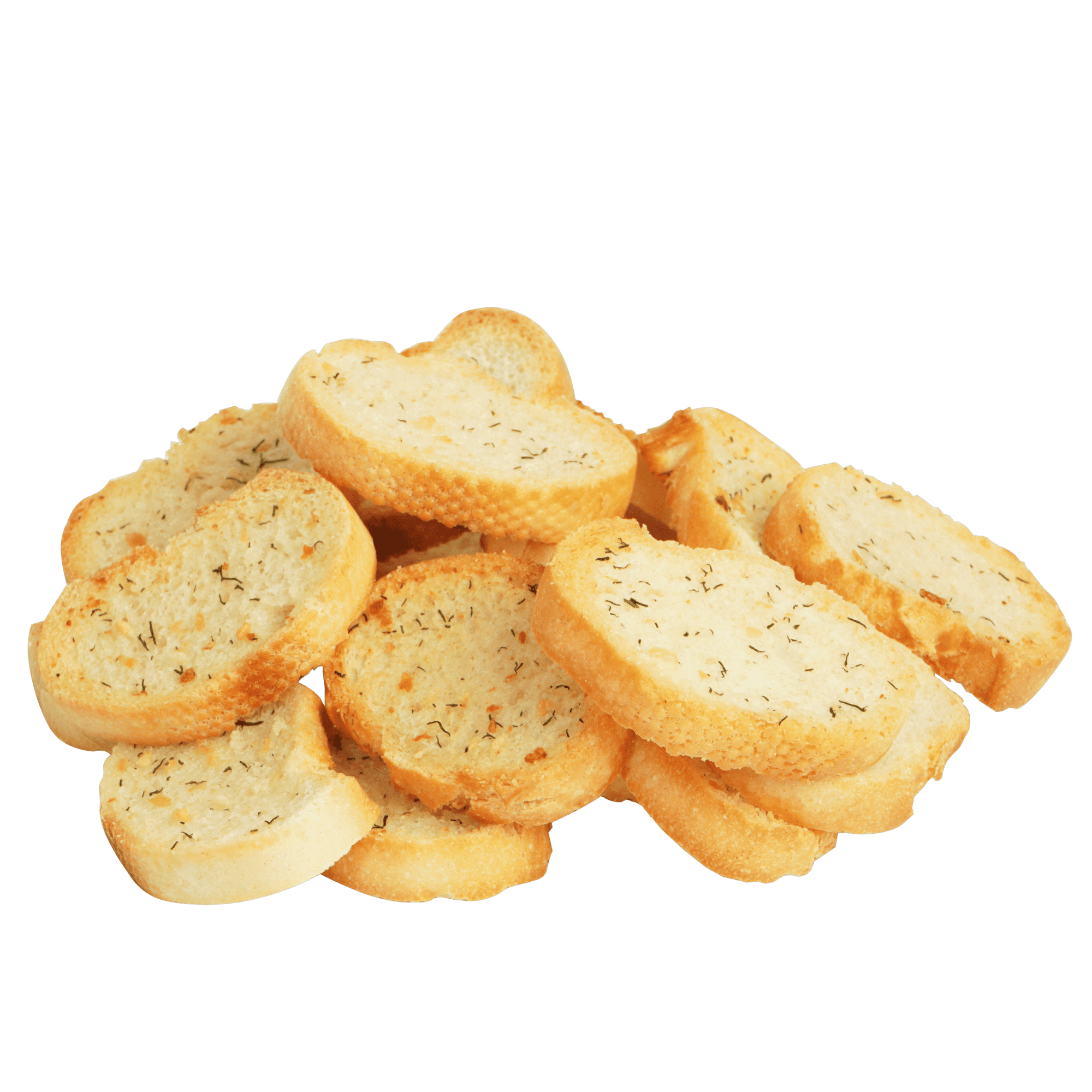 Slices of round shaped white bread baked with garlic butter.
