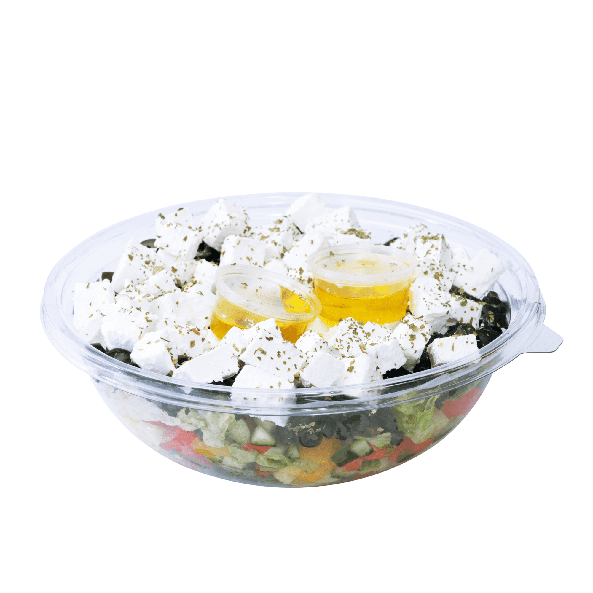 Fresh chopped lettuce, crumbly feta cheese with tomatoes and black olives.