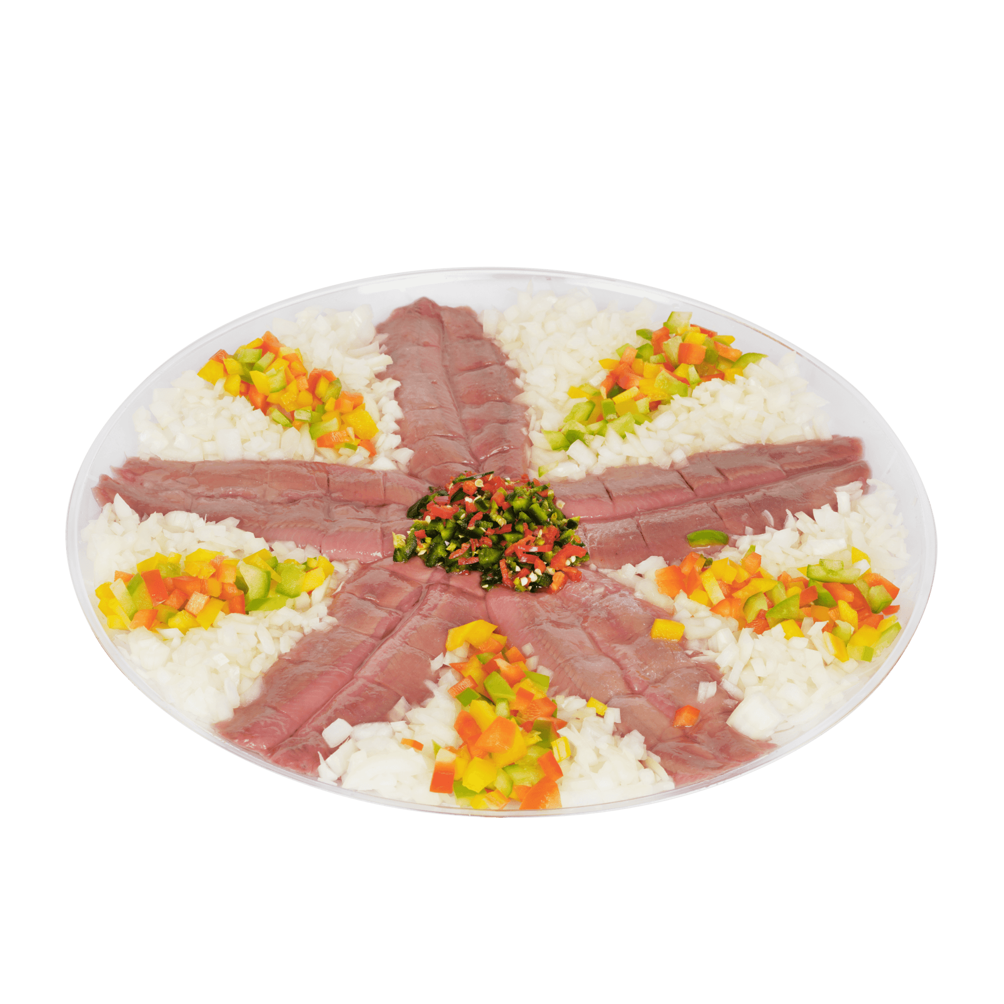 5 pieces of Smaltz herring, decorated with chopped onions and vegetables.