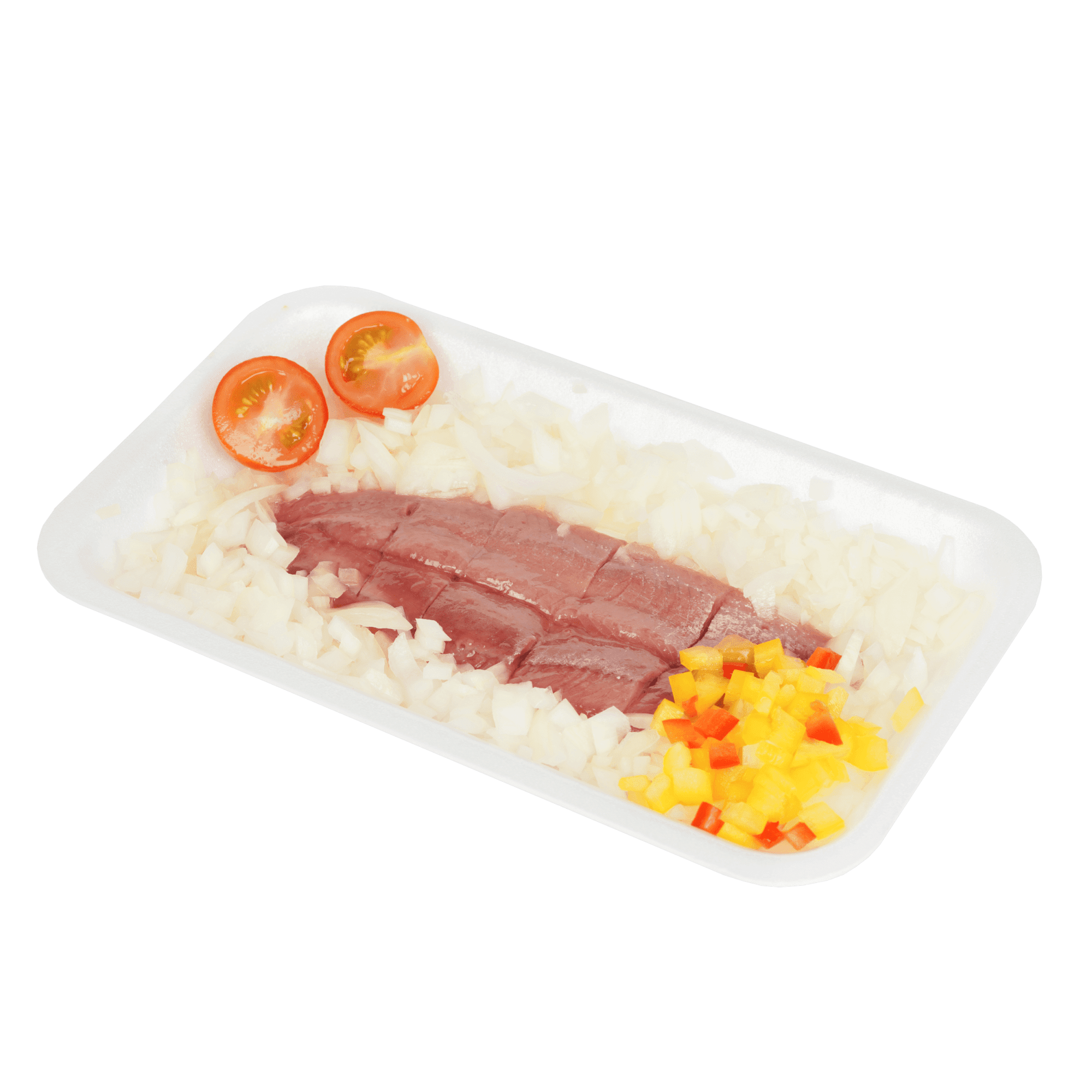 1.5 piece of Smaltz herring, decorated with chopped onions and vegetables.