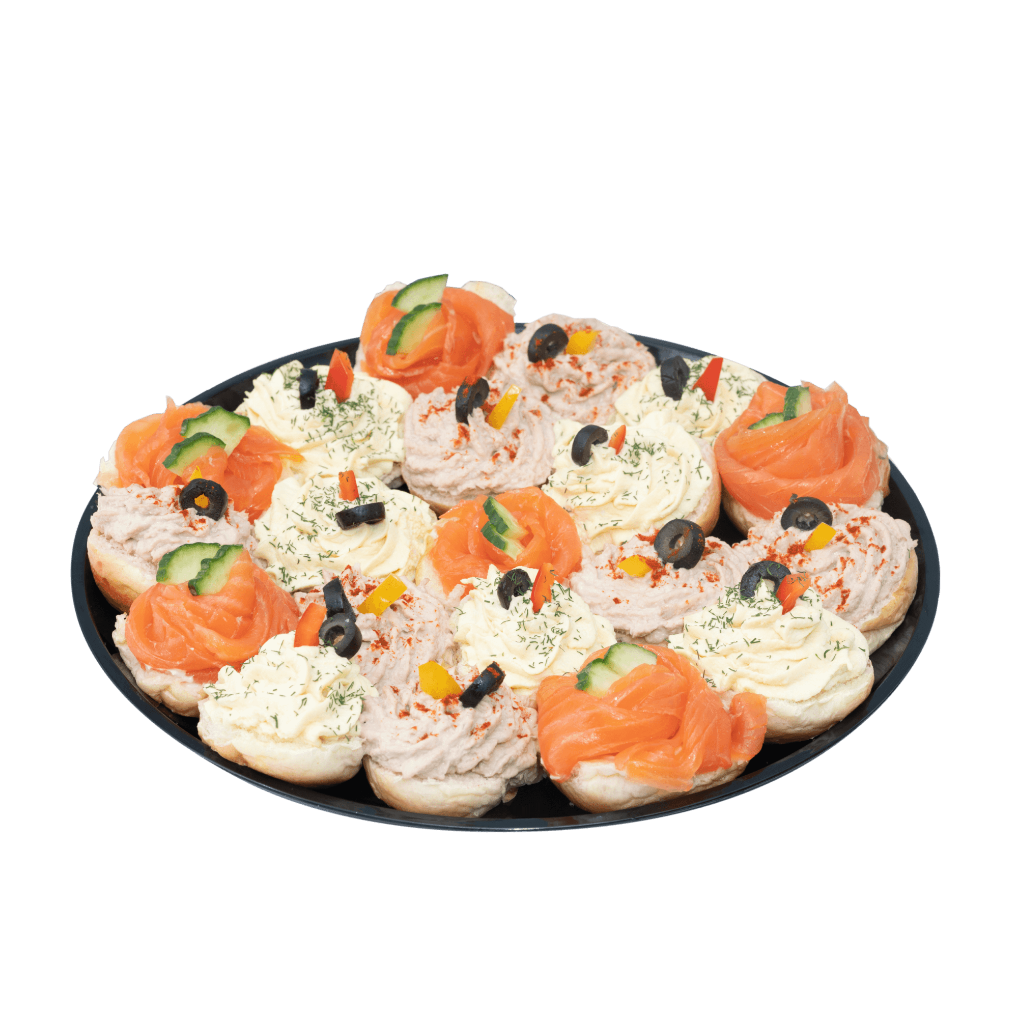 Platter of beautifully prepared and presented round bridge rolls, with swirls of smoked salmon and piped tuna and egg fillings. Topped with fresh vegetables and black and green olives.
