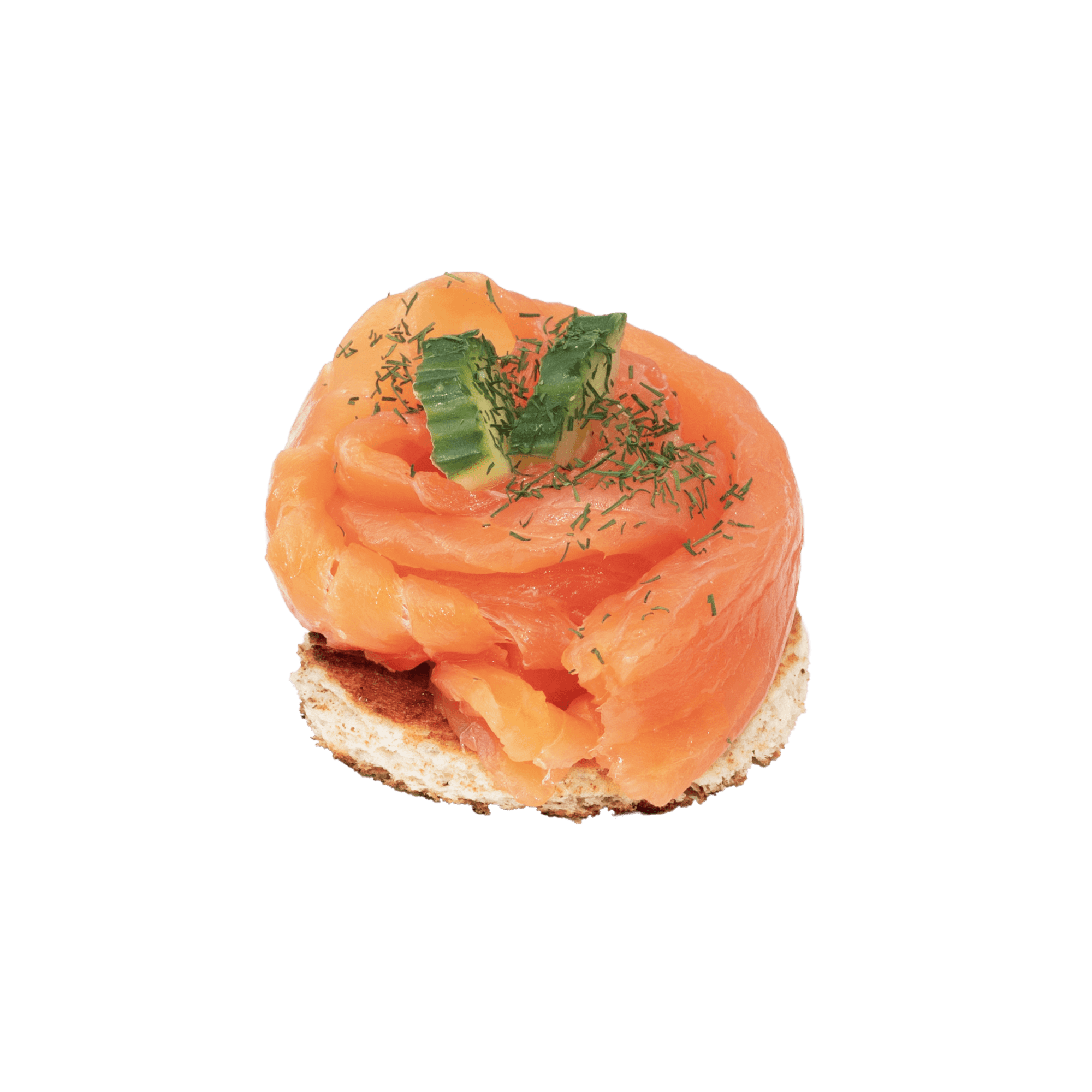 Small round shaped piece of toasted bread topped with generous chunk of locally produced smoked salmon.