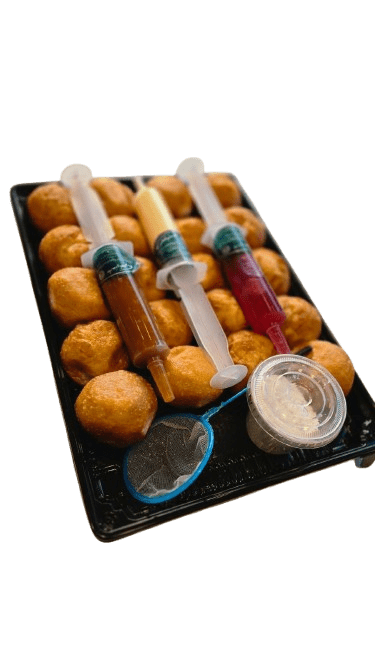 A platter of empty mini doughnuts, along with jam, custard, caramel, and a sieve with icing sugar to elevate your creations.