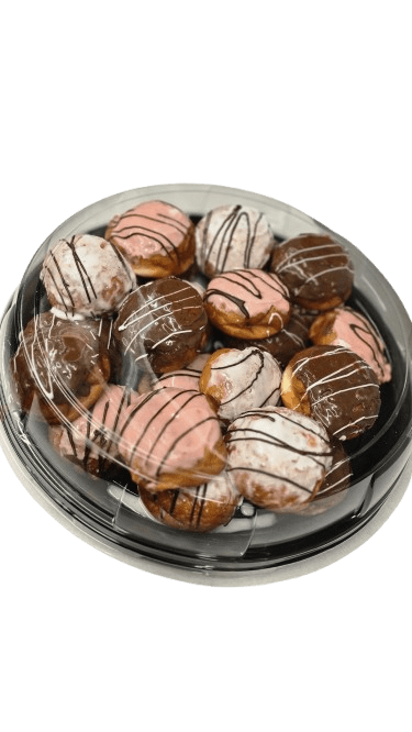 Platter of regular size iced doughnuts, variety of filling: Jam, Custard & Caramel